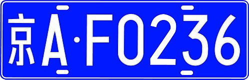 普通民用號牌:首字段為省級行政區劃簡(jiǎn)體漢字簡(jiǎn)稱(chēng)(如京、滬等);次字段為二級行政區劃拉丁字母代碼;第三字段為5位阿拉伯數字、拉丁字母混排。