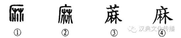 這是“麻生蓬中,不扶則直”的“麻”字。金文①的上部是“廠(chǎng)”,表示屋檐形,其內不是“林”字,而是掛著(zhù)一縷一縷的纖麻,曬干才能用。所以這個(gè)字是個(gè)會(huì )意字。小篆①也同于金文的寫(xiě)法。本來(lái)小篆的寫(xiě)法就已經(jīng)夠復雜的了,可是后世人認為麻是草屬,所以又在上部增加了一個(gè)草字頭,變成了上形下聲的新形聲字“蔗”??瑫?shū)③寫(xiě)起來(lái)實(shí)在不便。后來(lái)在實(shí)行簡(jiǎn)化字時(shí),又把草字頭去掉了。所以,④是楷書(shū)簡(jiǎn)化字,也就是今天的通用形體。