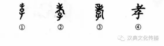 這個(gè)“孝”字也挺有意思。甲骨文①像長(cháng)著(zhù)長(cháng)頭發(fā)的老人。金文②的上部是面朝左長(cháng)著(zhù)長(cháng)頭發(fā)的駝背“老人”,“老人”之下有“子”(小孩),老人的手按著(zhù)小孩的頭,是小孩用頭扶持老人行走,真是個(gè)“孝子”啊。小篆③也基本上同于金文,只是老人的手不像了。④是楷書(shū)的寫(xiě)法,完全失去了象形的意味。