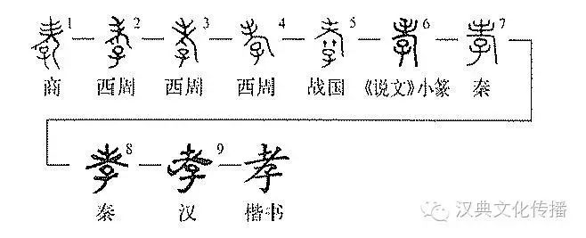 會(huì )意字。《說(shuō)文》:“孝,善事父母者。從老省,從子,子承老也。”從甲骨文孝字形體結構看,孝字像一個(gè)孩子攙扶老人之形,本義為孝順。孝字戰國楚簡(jiǎn)開(kāi)始就有了隸書(shū)的意味,秦代睡虎地秦墓竹簡(jiǎn)、漢初馬王堆漢墓帛書(shū)中的孝字直接承襲戰國楚簡(jiǎn)孝字形體而來(lái),最后演變?yōu)闈h魏隸書(shū)及今天的楷書(shū)形體?!墩f(shuō)文》篆文孝字形體是直接承襲西周金文孝字形體而來(lái),而出土秦漢文物上的篆文孝字形體略晚于《說(shuō)文》小篆孝字形體。在西周金文和西周文獻中,孝字是非常習見(jiàn)的字,多用為孝順之義。杜伯盨銘文:“其用享孝于皇神祖考。”“享孝”是用物品祭祀以示孝心之義。兮仲鐘銘文:“其用追孝于皇考己伯。”“追孝”即追念先祖以示孝心之義。《詩(shī)·周頌·雍》:“假(偉大)哉皇考,綏予孝子。”追孝、享孝皆為西周時(shí)代常用詞語(yǔ)。(周寶宏)