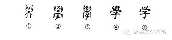 我們應當有“學(xué)而不厭,誨人不倦”的精神。①就是“學(xué)”字的甲骨文形體。朱芳圃先生說(shuō),上部像左右兩手結網(wǎng)之形,“結網(wǎng)為復雜之技能,非傳授不能獲得”。這個(gè)“獲得”就是“學(xué)”的意思。金文②的下部加了“子”更明白了,就是教孩童學(xué)習之意。小篆③的形體大體上同于金文。④是楷書(shū)的寫(xiě)法(繁體)。⑤是現在用的草體楷書(shū)化的簡(jiǎn)化字。