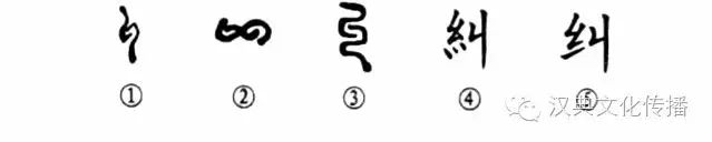 這是“糾纏不休”的“糾”字,本為象形字。①是甲骨文的形體,像瓜蔓或兩股繩索糾纏在一起的樣子。②是金文的形體,更像糾纏的樣子。③為小篆的形體,與甲、金文相似。④為楷書(shū)繁體字,增加表意的“系”旁,變成了會(huì )意兼形聲的字。⑤為簡(jiǎn)化字。