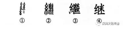 這是“夜以繼日”的“繼”字,本為象形字。①是金文的形體,像絲連續之形,故有“繼”義。②是小篆的形體,左邊又增加“絲”,右邊仍為絲的接續。③是楷書(shū)繁體字。④為簡(jiǎn)化字。