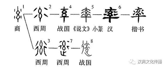 ,后世以加飾筆而旁點(diǎn)不省之形發(fā)展至今。西周文字又孳乳出從行、從辵一系,如字形3、7、8,殆強調其表率領(lǐng)、遵從等動(dòng)作之義?!奥省弊旨坠俏囊殉霈F,但不用其本義?!奥省钡谋玖x當是大索(《說(shuō)文》謂率的本義為捕鳥(niǎo)畢)。元周伯琦《六書(shū)正訛》:“率,大索也。象形。上下兩端象絞索之具,中象索,旁象麻枲之余。”按“率”當是“
