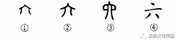 這是“六合同春”的“六”字,原為象形字。甲骨文①很像房舍的側視形,兩旁有房檐突出。②是金文的形體,與甲骨文基本相似。③是小篆的寫(xiě)法,已失去房屋之形。④是楷書(shū)的寫(xiě)法。