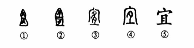 “欲把西湖比西子,淡妝濃抹總相宜?!边@個(gè)“宜”字,本為象形字。①是甲骨文的形體,其外形就像古代祭祀時(shí)盛牛羊等祭品的禮器,中間的兩個(gè)“A”字形代表祭品(牛羊肉)。②是金文的形體,較甲骨文復雜了一些。③是《說(shuō)文》中古文的寫(xiě)法,其外部變?yōu)椤板病弊?,像一個(gè)罩子。④為小篆的形體,較前者簡(jiǎn)單了一些。⑤為楷書(shū)的形體。