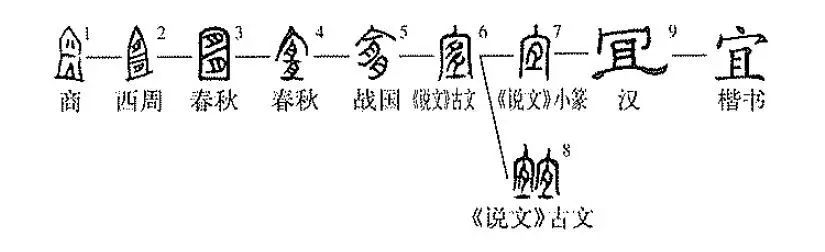 《說(shuō)文》:“宜,所安也。從宀之下,一之上,多省聲。”許慎所謂的“所安也”。并非“宜”字的本義而是引申義?!耙恕北緸橛蒙?,后轉為祭名,如《尚書(shū)·泰誓傳》:“祭社曰宜。”祭品是美味佳肴,故引申為此義,如《詩(shī)經(jīng)·鄭風(fēng)·女曰雞鳴》:“與子宜之。”大意是:給您美味佳肴。由合乎口味的“佳肴”又可引申為“合適”,如王符《潛夫論·相列》:“曲者宜為輪。”這是說(shuō):彎曲的適合于作車(chē)輪。由“合適”又可以引申為“應該”,如諸葛亮《前出師表》:“不宜妄自菲薄。”也就是說(shuō):不應該過(guò)分地看輕自己。柳宗元《非國語(yǔ)下·命官》:“官之命,宜以材耶,抑以姓乎?”也就是說(shuō):要任命官吏,應該看他的才能大小呢,還是看他姓什么(指出身什么門(mén)第)?