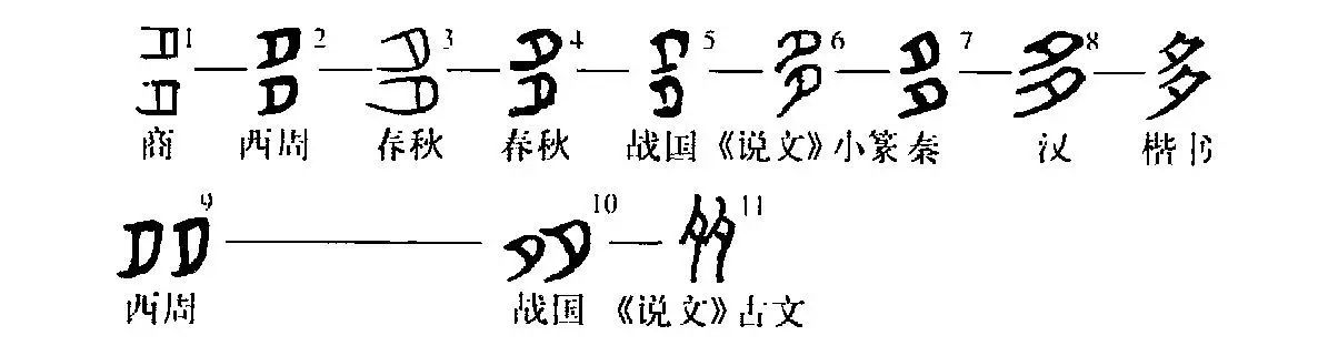 ”,亦重二“肉”。金文中“肉”、“夕”字形相近,故易混淆。《說(shuō)文》:“多,重也。從重夕。夕者,相繹也,故為多。重夕為多。重日為疊。凡多之屬皆從多。