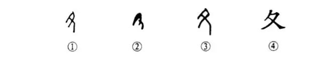 這個(gè)“夂(zhǐ 紙)”字是個(gè)象形字。甲骨文①很像腳根朝上、腳趾朝下的一只左腳。金文②那就更像一只左腳了。③是小篆的形體,與甲骨文①的形體相類(lèi)似??瑫?shū)④就根本沒(méi)有腳的樣子了。