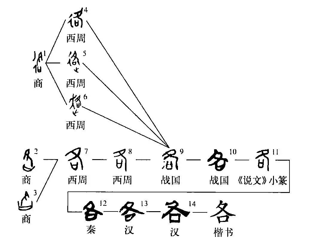會(huì )意字。從夂,像倒趾之形;從凵,像坎穴之形。古人穴居,凵即像其形,以足向居穴以會(huì )來(lái)至之義。典籍通作“格”?!案鳌北韥?lái)至之義,甲骨文因而或加“彳”旁以明行來(lái)之義。西周金文中從辵或走。《人》2941:“貞:王其各叀辛,王弗每(悔)?”(貞問(wèn):王在辛日來(lái),王不會(huì )有災禍吧?悔,悔吝義,即指災禍)曶壺:“王各于成宮。”甲骨文、金文中均使用其本義?;蛴米鳌翱汀?,“客”與“各”同源。越王鐘(《集成》144):“我臺(以)樂(lè )……大夫、賓各(客)。”或借為“格殺”之“格”。兮甲盤(pán):“各(格)伐獫狁。”此義之“各”,《說(shuō)文·手部》作“挌”(訓“擊也”),《廣雅·釋詁三》作“??”(訓同《說(shuō)文》)?!案鳌?,《說(shuō)文》訓“異辭也”,即今日所說(shuō)的各自義,此義產(chǎn)生較晚,約出現于戰國時(shí)期,如睡虎地秦簡(jiǎn)《法律答問(wèn)》139:“當貲各二甲。”馬王堆三號墓遣策:“鐃鐸各一。”(陳英杰)