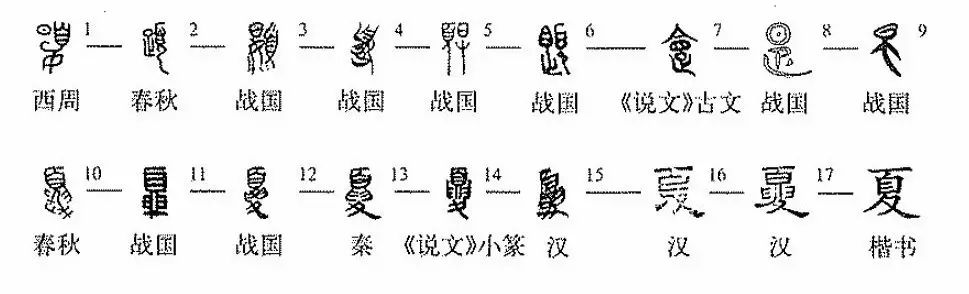 這個(gè)“夏”字的上古形體較為復雜。從金文①看,其上為“頭”,中間為“軀干”,兩側為“手”,其下為“足”,實(shí)際上就是“人”形。②為小篆的形體,也是“人”形,但已經(jīng)發(fā)生了偽變,人的身軀部分沒(méi)有了,只是一只大腳還在。③是楷書(shū)的形體,它是從小篆演變而來(lái),根本看不出人的形象了。