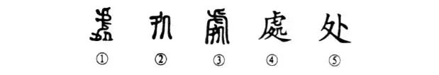 這是“何處望神州”的“處”字,本為會(huì )意字。①是金文形體,像一只蹲踞的老虎形,下部右邊的“幾”形可能是虎足的變形。②是小篆的形體,將金文的“虎”字頭又去掉了。③也是小篆的形體,又增加了“虎”字頭。④是楷書(shū)繁體字。⑤為簡(jiǎn)化字。