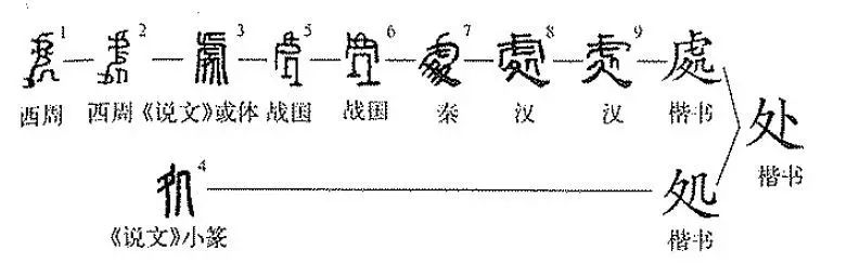 形可以認為是虍字之繁,也可以認為“人”形與“虍”形的合體。因此,西周金文的處字可以認為是從人從止(倒止)從幾虍聲。這一形體當為處字最早的形體,并為《說(shuō)文》或體及后來(lái)典籍繼承。在戰國時(shí)代處字已經(jīng)簡(jiǎn)化為從幾虍聲的字,《說(shuō)文》篆文“処”當是省掉虍聲的形體。漢代隸書(shū)的寫(xiě)法是簡(jiǎn)體“処”形體訛變。(周寶宏)