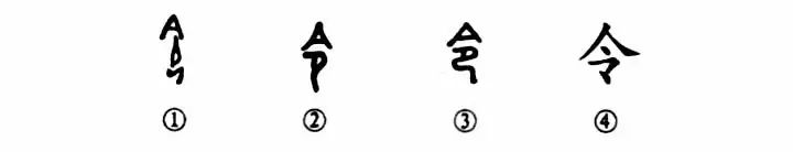 這個(gè)“令”字也挺有意思,你看甲骨文①上部的三角形之物是屋頂(或大傘蓋),下面是面朝左而跪坐著(zhù)的一個(gè)人,像是在發(fā)布命令。金文②基本上同于甲骨文的形體,其中的“人”形惟妙惟肖。③是小篆的形體,下面的“人”已偽變了。④為楷書(shū)形體。根本看不出“屋”下的“人”形了。