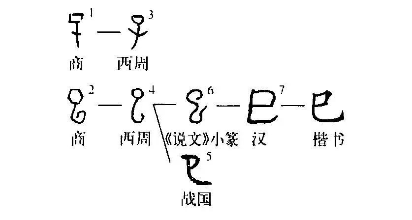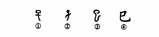這個(gè)“巳”字讀作sì,本為象形字。甲骨文①就是“子”,郭沫若認為:“實(shí)象人形?!雹谑墙鹞牡男误w,與甲骨文的形體相類(lèi)似,更像人。③是小篆的寫(xiě)法,已發(fā)生了訛變。④是楷書(shū),由小篆的形體演變而來(lái)。
