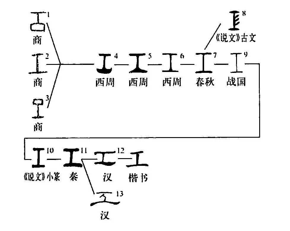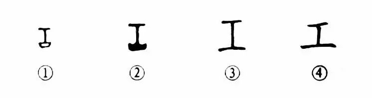 的變化過(guò)程,最終也把下底簡(jiǎn)化為瘦筆單橫。戰國古文有在中豎右側加“彡”形飾筆的形式,漢隸有故意把中豎寫(xiě)成“