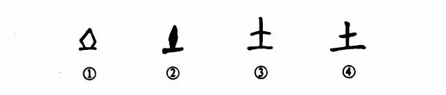 “太山不讓土壤,故能成其大?!边@個(gè)“土壤”的“土”字是個(gè)象形字。甲骨文①表示從地面上突起來(lái)的一堆土。古人非常敬重土,有了土就有農業(yè),有了農業(yè)就有衣食。所以人們把這種堆起來(lái)的土看成是神,并向它祭獻。金文②基本上與甲骨文的形體相同,只是將虛心變?yōu)閷?shí)心罷了——這與青銅的鑄造有關(guān)。③是小篆的形體。④是楷書(shū)的形體。