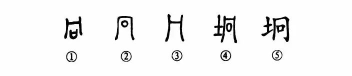 這個(gè)“坰”字讀作jiōng,本為象形字。①是金文的形體,是一面開(kāi)口的區界形,中間的“口”表示京都所在,這就是表示京都的遠郊;②是《說(shuō)文》中的古文形體。③是小篆的寫(xiě)法,中間的“口”沒(méi)有了。④也是小篆的形體,在金文形體的左邊又增加表意的“土”旁,變成形聲字了。⑤為楷書(shū)形體。