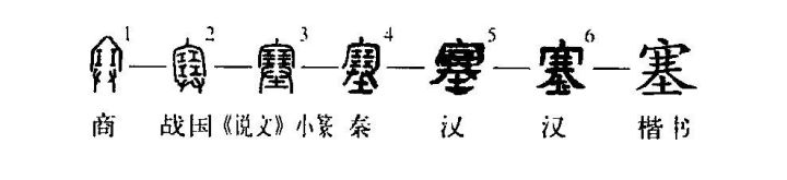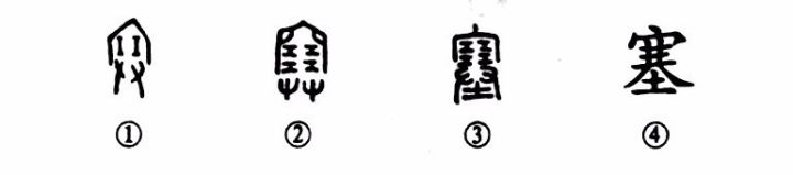 這是“塞向墐戶(hù)”的“塞”字,是個(gè)會(huì )意字。甲骨文①的上部是個(gè)“宀”(房子)字,中間的兩個(gè)“工”表示一堆東西,最下部是兩只手,也就是用手把一堆東西塞到房子之中的意思。金文②則把甲骨文上部的“宀”改為“穴”,表示把洞塞好。③是小篆的形體,是在最下部又增加了個(gè)“土”字,這就表示把洞塞好以后再用土封上。④是楷書(shū)的形體,是由小篆演變來(lái)的。