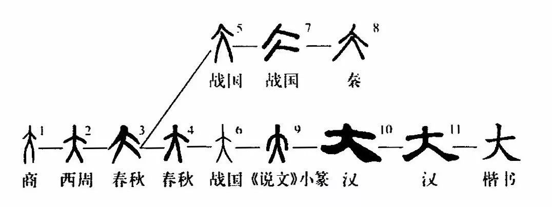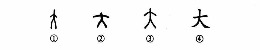 這個(gè)“大”字是個(gè)象形字。甲骨文①、金文②、小篆③都像“人”形??瑫?shū)④則把人的兩臂伸平變成了一橫,這樣“大”字就不像“人”形了。