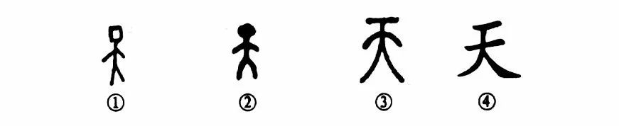 大道之行也,天下為公?!边@個(gè)“天”字本為象形字。甲骨文①就像正面站著(zhù)的“人”形,突出了上部的方框“頭”。②是金文的形體,更像“人”形。③是小篆的寫(xiě)法,上部的“一”仍表示“頭”。④是楷書(shū)的寫(xiě)法。