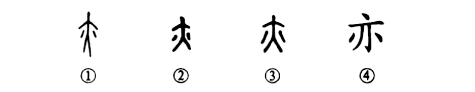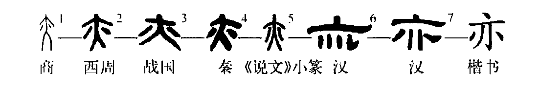 這個(gè)“亦”字是個(gè)典型的指事字。甲骨文①是正面立著(zhù)的一個(gè)人,兩臂之下的兩個(gè)點(diǎn)兒就是指事符號,表示這里就是腋下。金文②也是這種形體。小篆③與甲金文字一脈相承。④是楷書(shū)的形體,中間的“人”形變得根本不像了?!耙唷弊值谋玖x是“腋”(上古沒(méi)有“腋”字)。但因為后世“亦”字被假借為虛詞用了,其義大致相當于現代漢語(yǔ)中的“也”字,“亦”字當“腋”講的本義就只好重新造一個(gè)新的左形(月即肉)右聲(夜)的形聲字“腋”來(lái)代表。從此,“亦”與“腋”有了明確的分工,“亦”字只作虛詞用,而“腋”字就代替了“亦”字的本義。