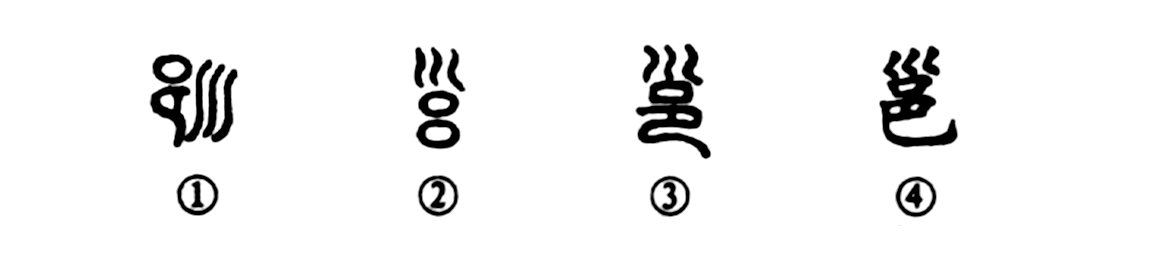 這是“君臣邕穆”的“邕”字,讀作yōng。本為象形字。①是金文的形體,右邊是“川”,左邊是“邑”。②是《說(shuō)文》中籀文的形體,上部為“川”,下部的兩個(gè)圓圈像積水的沼澤。水入沼澤不能流通,這就表示“壅塞”的意思。③是小篆的形體,下部的沼澤之形訛變?yōu)椤耙亍?,但意義未變。④是楷書(shū)的形體。