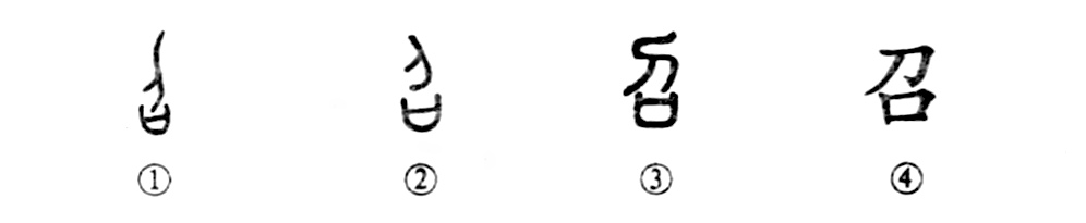 這個(gè)“召”字本為形聲字。①是甲骨文的形體,上部是刀形,表聲,下部是“口”,表示呼喚或打招呼。②是金文的形體,與甲骨文基本相同。③是小篆的形體。④為楷書(shū)的寫(xiě)法。前后一脈相承。