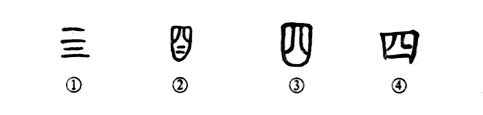 “四郊陰靄散,開(kāi)戶(hù)半蟾生?!边@里的“四”字原為指事字。甲骨文①的四條橫線(xiàn)即代表“四”,該形體沿用到戰國。②是金文的形體,像鼻子出氣的樣子,由原來(lái)的指事字變?yōu)橄笮巫至?。郭沫若先生認為:“四乃呬之初文。”③為小篆的形體,比金文稍有省略。④為梢書(shū)的寫(xiě)法。