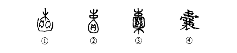 “三十年前共苦辛,囊螢曾寄此煙岑?!边@個(gè)“囊”字,本為象形字。①是甲骨文的形體,很像一個(gè)扎住口的大口袋,口袋里面裝著(zhù)兩只貝。②是金文的形體,更像一個(gè)大口袋,里面裝了一只貝。③是小篆的形體,像上下兩頭都扎住的大口袋,口袋內的字通“襄”,表聲。④是楷書(shū)的寫(xiě)法。
