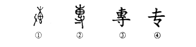 “三十侍中郎,四十專(zhuān)城居?!边@個(gè)“專(zhuān)”字,原為會(huì )意字。甲骨文①的右邊象紡線(xiàn)用的“紡磚”,左邊是一只手,轉動(dòng)紡磚而紡線(xiàn)。②是小篆的形體,其下的“寸”仍為“手”。③是楷書(shū)繁體字。④為草書(shū)楷化的簡(jiǎn)化字。