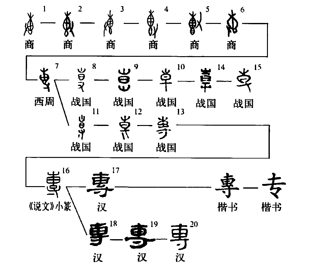 會(huì )意兼形聲字。甲骨文作從又,從?。▃huān),叀亦聲。表意偏旁又為手之象,表示專(zhuān)的本義與手相關(guān);形旁兼聲旁叀為紡磚之象,表示專(zhuān)的本義與紡磚相關(guān);同時(shí)表聲,專(zhuān)與叀并為舌面音元部。甲骨文專(zhuān)字多歧,手可左可右;紡磚有底、身、頂,腰身有纏線(xiàn)與不纏者,所纏線(xiàn)數不一。西周時(shí)基本上固定作