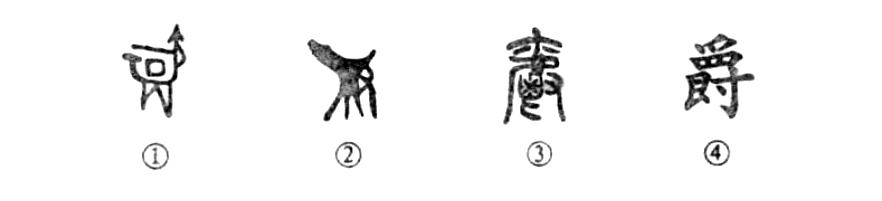 這個(gè)“公爵侯爵”的“爵”宇本為象形字。①是甲骨文的形體,就像古代酒器的形狀,下有足,用以溫酒或盛酒,盛行于商代和西周初期。②是金文的形體,更像酒器的形狀,其右邊又增加了一只手。③是小篆的形體,其下部訛變?yōu)閺摹佰耍ü糯漓胗玫囊环N酒),變得相當復雜。④是楷書(shū)的寫(xiě)法。