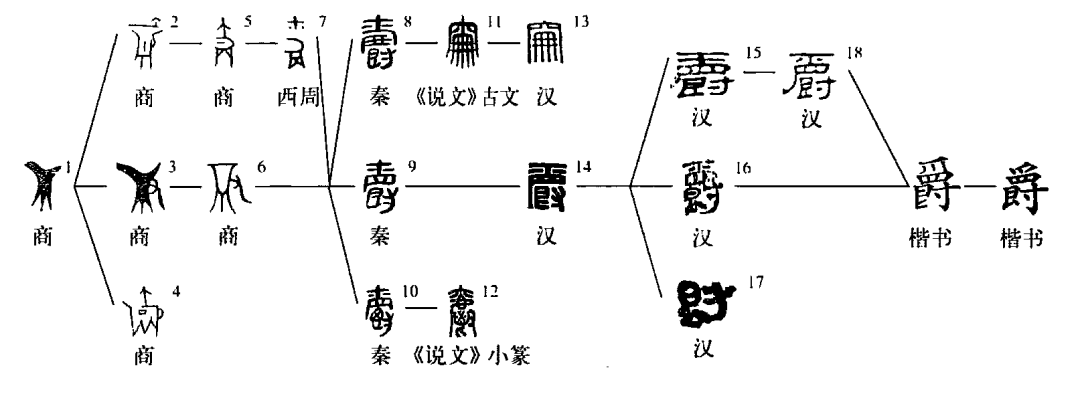 ”形之所由,而且成為漢隸“?” “罒”兩種寫(xiě)法的發(fā)端?!?”形在漢隸中多見(jiàn), “罒”形在漢隸中并不普遍,但后者傳入楷書(shū)?!墩f(shuō)文》古文“爵”字可能出于漢初,因為它實(shí)際是截取秦簡(jiǎn)一種字形上部后的變化形式;而漢初馬王堆帛書(shū)“爵”字又有截取秦或漢初“爵”字下部的形式“??”。幾經(jīng)變化的爵柱形,在楷書(shū)中變成了扁“爪”形,因此,楷書(shū)舊字形寫(xiě)作“