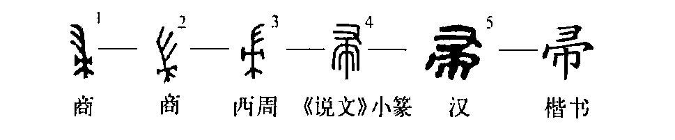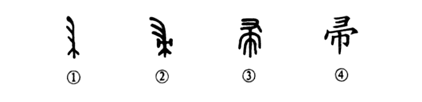 這是“敝帚自珍”的“帚”字,讀zhǒu(肘),是一個(gè)象形字。甲骨文①就像一把笤帚,上部的帚苗是掃地的部分,下端是笤帚把兒。金文②的形體更像一把掃炕或掃床的笤帚。小篆③則發(fā)生了較大的變化,已經(jīng)不像笤帚的樣子了,其下部手可握持的部分變成了“巾”字,因此許慎在《說(shuō)文解字》中把“帚”字放在“巾”部里。其實(shí)這“帚”字與“巾”字在詞義上毫無(wú)關(guān)系。④是楷書(shū)的形體,連一點(diǎn)笤帚的模樣兒也沒(méi)有了。