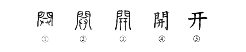 “太白發(fā)句,謂之開(kāi)門(mén)見(jiàn)山?!边@個(gè)“開(kāi)”字原為會(huì )意字。①是璽文的形體,外部是兩扇大門(mén),內部的“一”是門(mén)閂,下面是一雙手,表示用雙手拉開(kāi)門(mén)閂。②是《說(shuō)文》中的古文形體,與璽文基本相似。③是小篆的形體,內部發(fā)生了訛變。④為楷書(shū)繁體字。⑤為簡(jiǎn)化字。