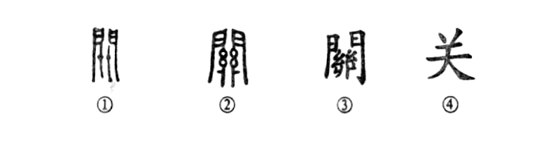“秦時(shí)明月漢時(shí)關(guān)?!边@個(gè)“關(guān)”字本為會(huì )意字。①是金文的形體,外為門(mén)形,門(mén)中有一對門(mén)閂,表示“關(guān)門(mén)”之意。②是小篆的寫(xiě)法,較金文復雜一些。③是楷書(shū)繁體字。④為簡(jiǎn)化字。