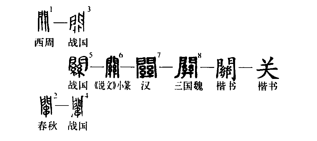 形聲字。從門(mén),??聲。金文關(guān)為會(huì )意字,從門(mén),門(mén)內有閂。戰國文字“關(guān)”從門(mén),中像門(mén)閂,小篆變?yōu)樾温曌?。南北朝以?lái)的俗字,曾把“關(guān)”中間的部分簡(jiǎn)作“關(guān)”。近代民間又將外面的“門(mén)”省略,寫(xiě)作“關(guān)”?!逗?jiǎn)化字總表》采用了這種寫(xiě)法。本義是門(mén)閂。《墨子·備城門(mén)》:“門(mén)植關(guān)必環(huán)錮。”引申為關(guān)門(mén)。晉陶潛《歸去來(lái)兮辭》:“門(mén)雖設而常關(guān)。”由關(guān)門(mén)的關(guān),引申為關(guān)口。鄂君啟舟節:“女(如)載馬牛羊以出內(入)關(guān)門(mén),則政(征)于大府,母(毋)政(征)于關(guān)。”《孟子·梁惠王下》:“臣聞郊關(guān)之內有囿方四十里。”人體的各部位,常以關(guān)名,即關(guān)節。還可指機械的發(fā)動(dòng)處。《后漢書(shū)·張衡傳》:“施關(guān)發(fā)機。”牽連,涉及是后起意義。唐劉知幾《史通·敘事》:“言有關(guān)涉,事便顯露。”(胡偉郭敏珊)