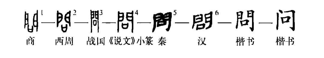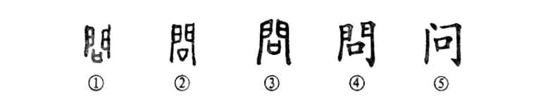 這是“松下問(wèn)童子”的“問(wèn)”字。甲骨文①是門(mén)內有口,表示在門(mén)內發(fā)問(wèn),這是個(gè)會(huì )意兼形聲的字。②是戰國印文,與甲骨文相同。③是小篆的形體。④是楷書(shū)繁體字。⑤為簡(jiǎn)化字。