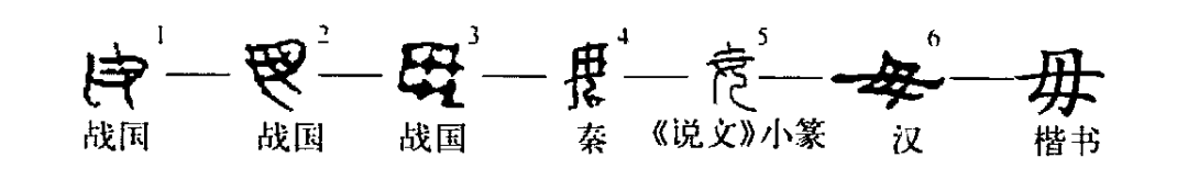 女之分化字。從女,中間加一橫筆為分化符號,女亦聲。女、母、毋均一字之分化。戰國時(shí)始分化出“毋”字。楚文字“毋”字或作
