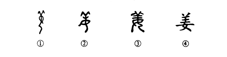 這個(gè)“姜”字本為會(huì )意兼形聲的字。甲骨文①是一個(gè)面朝左跪坐的女人,頭上戴的羊角冠,表示“很美”的意思。同時(shí),“羊”亦表聲。②是金文的形體,與甲骨文相似。③是小篆的寫(xiě)法。④為楷書(shū)的寫(xiě)法。