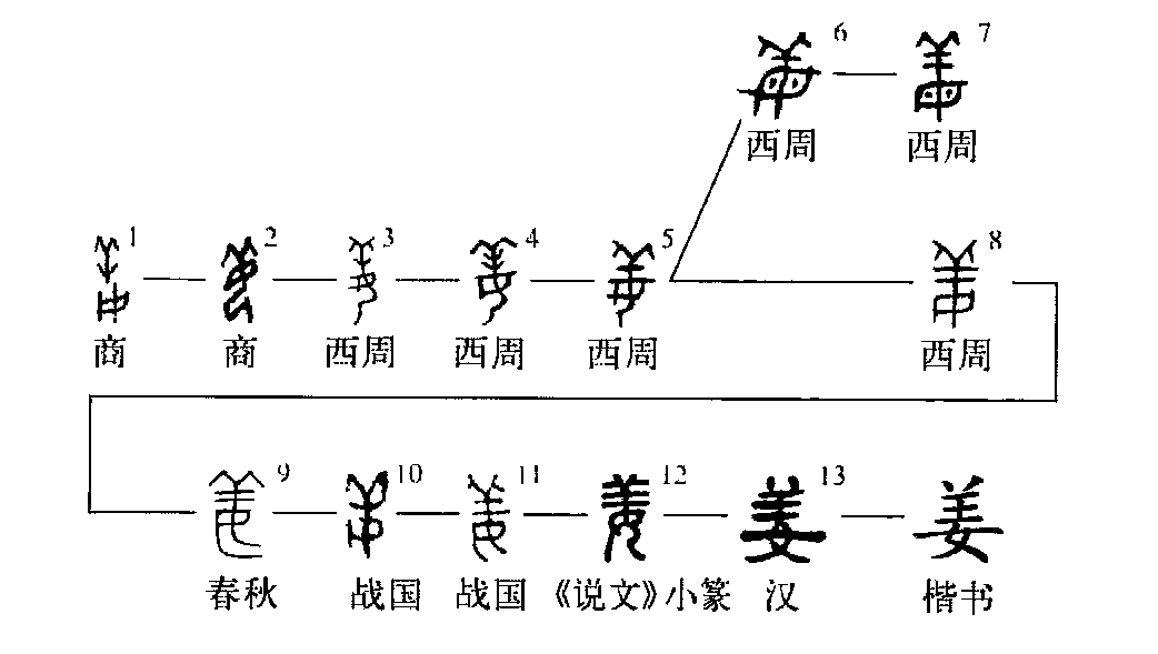 ”形者,為《說(shuō)文》篆文所本。本義為姜姓。 《說(shuō)文》:“姜,神農居姜水,以為姓。”睘卣:“王姜令(命)乍(作)冊睘安尸(夷)白(伯)。” “王姜”乃姜姓的王后。《詩(shī)·大雅·生民》:“厥初生民,時(shí)維姜嫄。”毛傳:“姜,姓也?!照?,炎帝之后。”(徐在國)