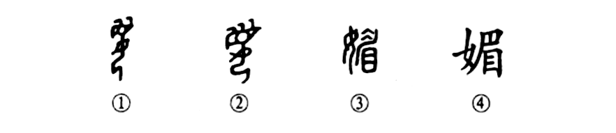 “回頭一笑百媚生,六宮粉黛無(wú)顏色?!边@就是“百媚生”的“媚”字。甲骨文①是面朝右跪著(zhù)一個(gè)人(女),頭部是一只大眼睛,眼睛的上部是彎曲的兩根長(cháng)眉毛,表示好看。金文②的形體基本上同于甲骨文。③是小篆的形體,變成了左形(女)右聲(眉)的形聲字了。④是楷書(shū)的寫(xiě)法,與小篆的形體結構完全一致。