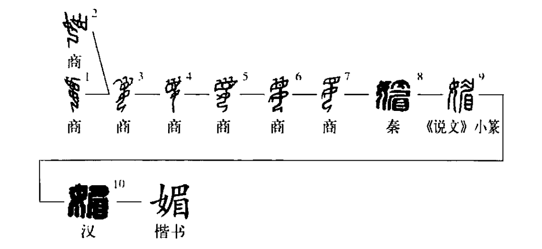 形聲字。從女,眉聲。甲骨文“媚”字所從“女”多在“眉”下,商代金文承之。子媚爵“媚”字所從的“眉”或訛省為“目”?!懊肌睆摹澳俊?,上像眉之形,詳參“眉”字條。本義是喜愛(ài)。《說(shuō)文》:“媚,說(shuō)(悅)也。”《詩(shī)·大雅·下武》:“媚茲一人。”鄭玄箋:“媚,愛(ài)也。”引申義有巴結、討好、美好等。商代甲骨文、金文“媚”,均為人名。(徐在國)