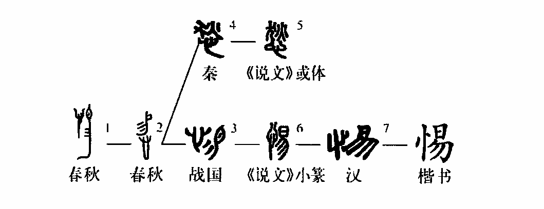 形聲字。從心,易聲。金文字形為左“心”、右“易”,或作上“易”、下“心”;小篆由金文演變而來(lái),為左右結構?;蝮w與秦簡(jiǎn)一脈相承,作從“心”、“狄”聲,為上下結構;隸楷文字由小篆演變而來(lái),寫(xiě)作“惕”。本義為恭敬。《說(shuō)文》:“惕,敬也。”由恭敬引申為警惕、謹慎,又引申為畏懼、戒懼。《書(shū)·盤(pán)庚上》:“惟汝含德,不惕予一人。”《左傳·襄公二十二年》:“無(wú)日不惕,豈敢忘職。”杜預注:“惕,懼也。”由畏懼引申為憂(yōu)傷?!疤琛痹诠糯€有疾、急速之義。(郭小武葉青)