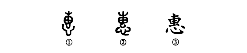 “恩惠及于天下?!边@個(gè)“惠”字本為會(huì )意字。①是金文的形體,上部是“專(zhuān)”的本字,下部為“心”。徐鍇說(shuō):“為惠者,心專(zhuān)也?!笨梢?jiàn)“專(zhuān)心為惠”。②是小篆的形體。③是楷書(shū)的寫(xiě)法。