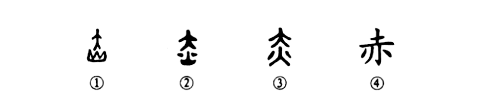 “赤日炎炎似火燒”的“赤”字本是個(gè)會(huì )意字。甲骨文①的上部是個(gè)“人”(大),下部是“火”,人被火烤紅了。金文②與甲骨文的形體結構完全一致,只是變得筆形粗壯。③是小篆的寫(xiě)法,仍然是上“人”(大)下“火”??墒堑搅丝瑫?shū)④就把“大”變成了“土”,“火”也不像“火”了。