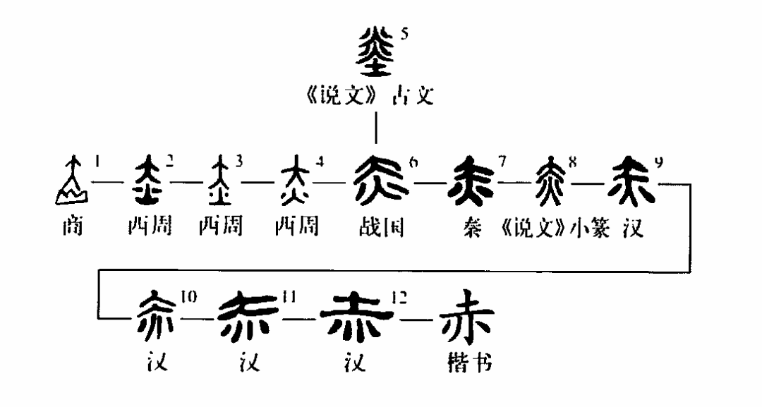 會(huì )意字。從大,從火。甲骨文、金文字形均為上“大”、下“火”;《說(shuō)文》古文“大”變“炎”,“火”變“土”;小篆仍作上“大”、下“火”:到楷書(shū)時(shí),“大”變成了“土”,“火”中間拆成了兩豎筆,再也不像“火”字了。本義為火紅色。《釋名·釋采帛》:“赤,赫也,太陽(yáng)之色也。” 《合集》29418:“癸丑卜暊貞:左赤馬其