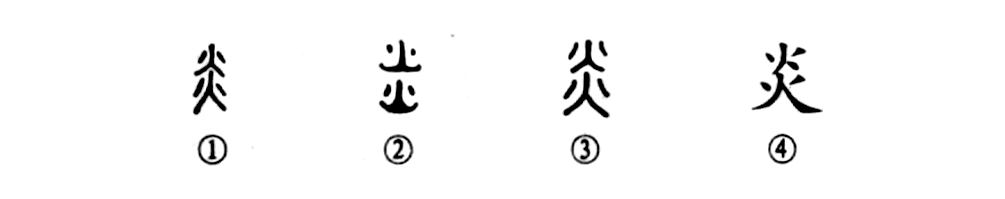 “炎”字是個(gè)會(huì )意字。甲骨文①的上下兩把大火,火光沖天,表示火旺。②是金文形體,同樣是兩把大火。③是小篆形體,同甲骨文的形體更為接近。④是楷書(shū)形體,由小篆直接演變而來(lái)。