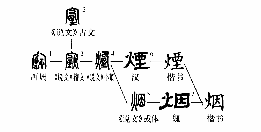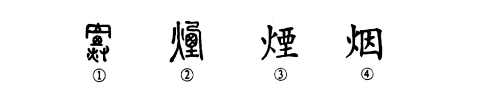 “日照香爐生紫煙,遙看瀑布掛前川?!边@個(gè)“煙”字本為會(huì )意字。古璽文①的上部為“窗”,左下角為“火”,右下角為“手”,表示手執火而燃燒,煙自窗出。②是小篆的形體,變成了“從火,垔聲”的形聲字了。③是楷書(shū)異體字的寫(xiě)法,現已廢除。④為保留使用的“煙”字,也是形聲字,但其筆畫(huà)較少,書(shū)寫(xiě)方便。